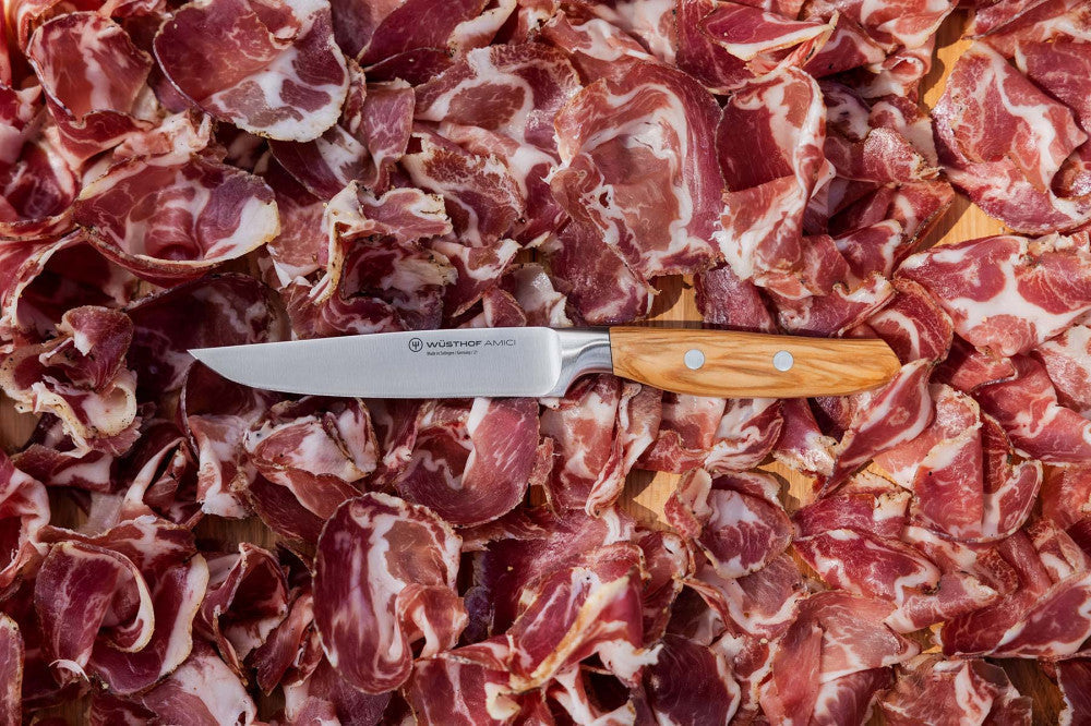 Forged from a single piece of WÜSTHOF steel, Amici knives are perfectly balanced and feature an elegant design with curved lines flowing from blade to handle. The outstanding sharpness enhances the pleasure of preparing meals. More than just tools, these are companions in creating memories and embodying "la dolce vita"–the joyful zest for life.
