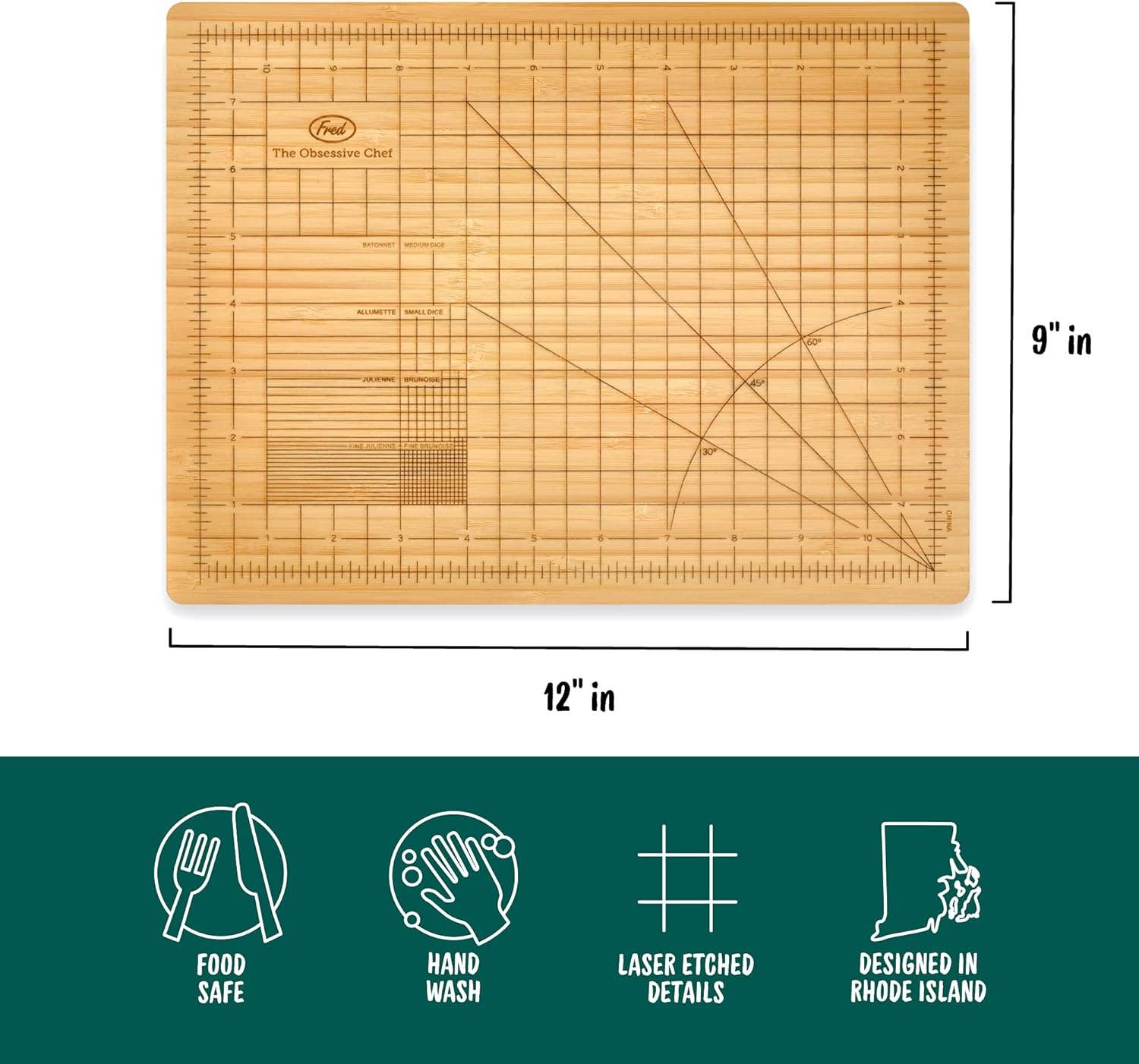 Obsessive Chef je doska z udržateľného bambusu, ktorá jasne ukazuje najpresnejšie miery a uhly pre krájanie.