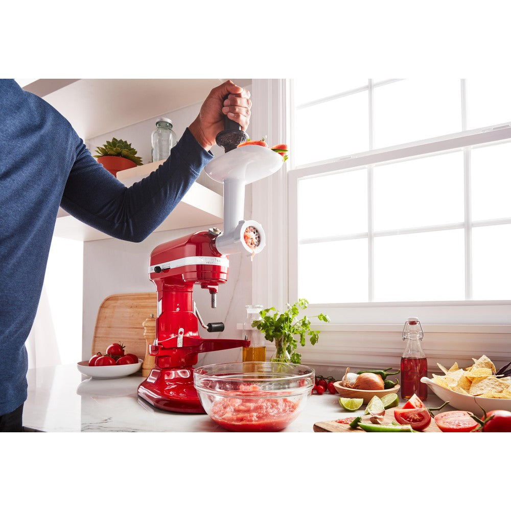 How does it work? Assemble the KitchenAid meat grinder and plug it into the multipurpose attachment hub of any KitchenAid stand mixer (sold separately). Then, turn the mixer to speed 4 and start pushing the food in with the pusher. You’ll get a quality grind of everything from vegetables to raw meat to fruit, nuts, fish and even bread. Throw it in and watch the perfectly minced ingredients emerge. You’ll soon become an expert. TIP: For the best results, meats should be extremely cold, even partially frozen.