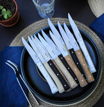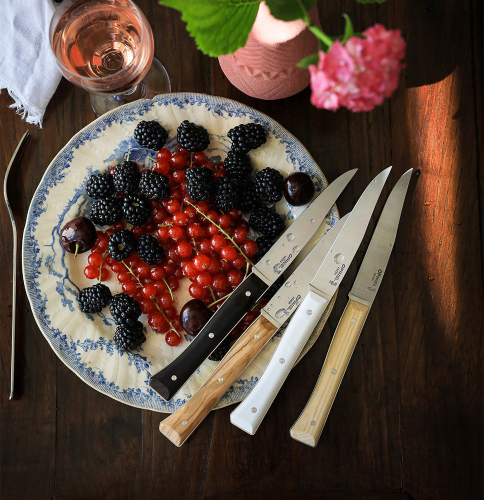 Four knives with a smooth full tang stainless steel blade. No food can resist them! Four handles in different woods and materials: natural woods with ash and olive, a stabilised wood with dark ash, and an eco-material VittEr® made of compressed paper that is dishwasher safe.
