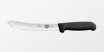 Victorinox Fibrox Chef's Knife with a straight edge, stiff, narrow, thick 15 cm blade and black plastic handle.