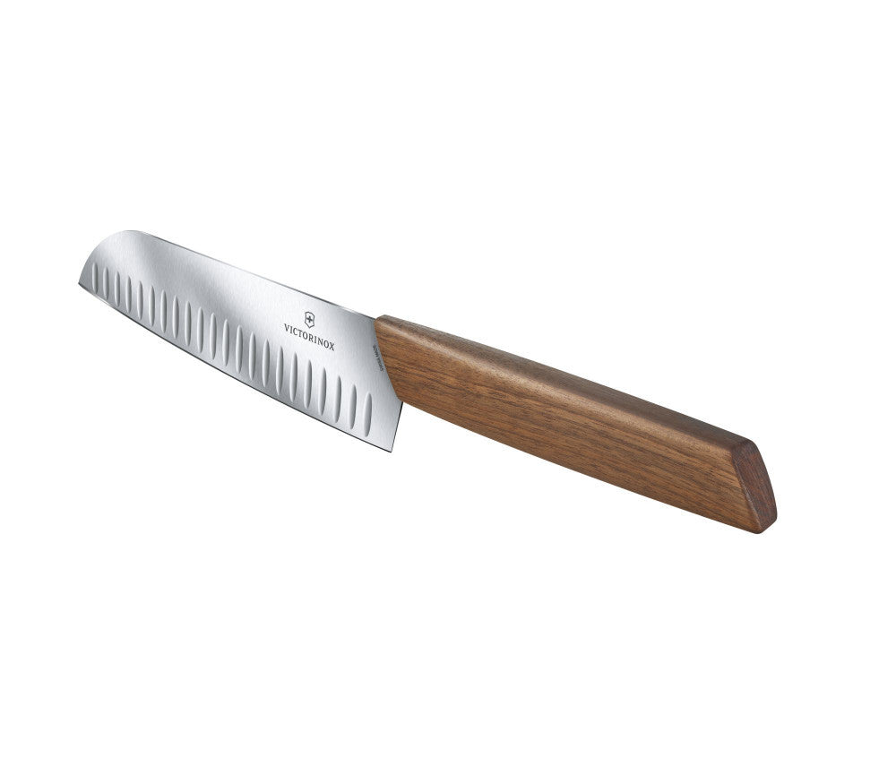 Victorinox Swiss Modern Santoku with 17 cm long ribbed blade and walnut handle.